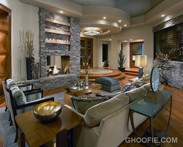 Bright living room with ceiling light decor, wooden and rock combination decorate in the modern living areas.