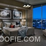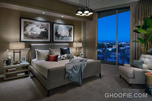 Master luxury grey bedroom interior design with modern chandelier and exotic city view on the night.