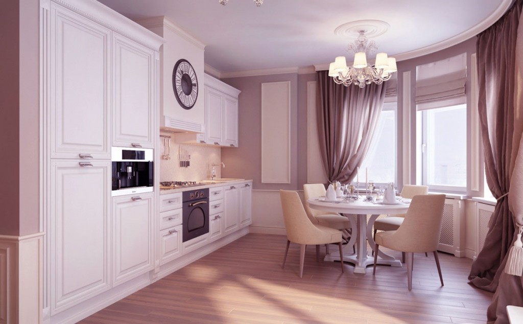Kitchen and dining room in one spaces with luxury chandelier. Wall paneling is picked out in white to brighten of room.