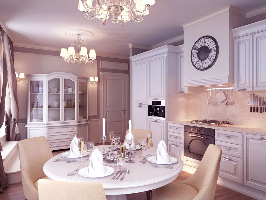 Luxury dining room with chandelier and table manner. Dining room with kitchen furniture integrated chrome coffee maker.