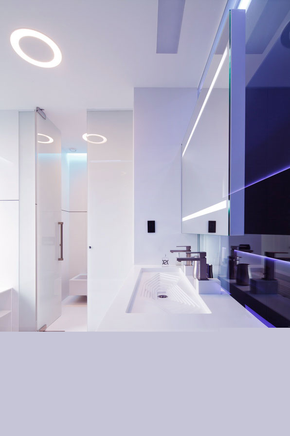 Modern white purple bathroom scheme with modern basin designed by Square One.