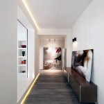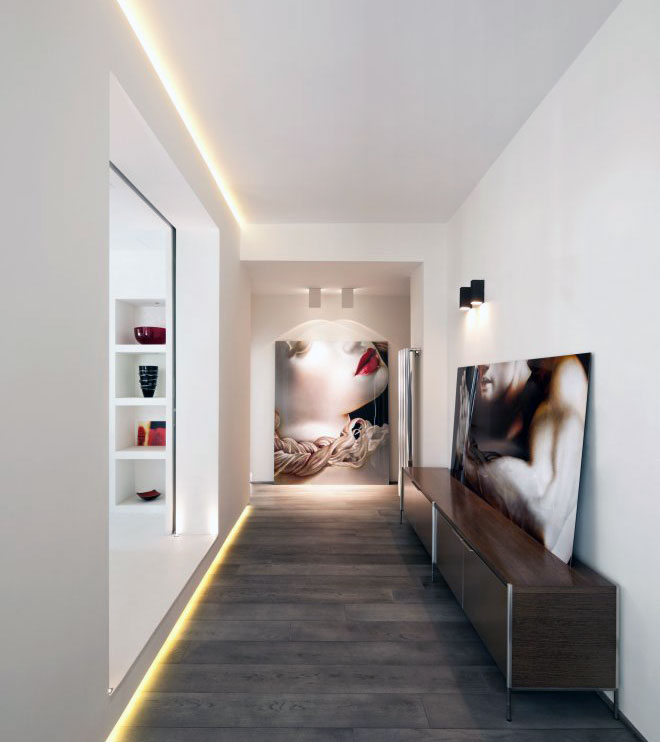 Modern hallway with recessed wall lighting and wooden floor. The project by Carola Vannini Architecture.