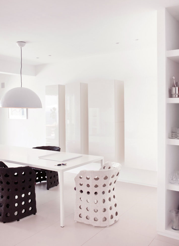 Black white dining room white pendant chandelier by Belgian firm JUMA Architects and Minimum Arquitectura.