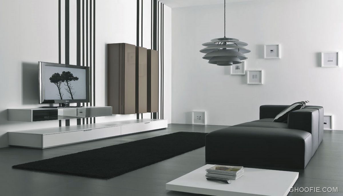 Black white living room with tv wall mount. Modern minimalist living room with unique chandelier ideas.
