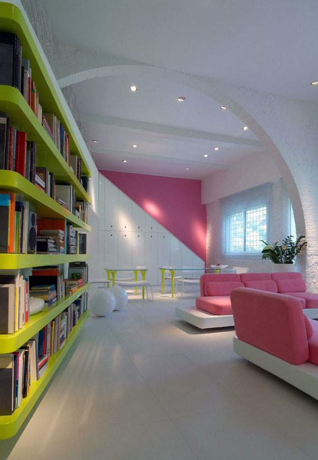 These new interior design ideas are fresh from Italian architect Simone Micheli. They are predominantly using white color. They’re clean and soft interior designs, paired with sunshine yellow and carnation pink color. Yellow and pink are only used as accent colors, and fit perfectly. Modern Gloss Color Bookcase Design. Pink and green color living room. Read full article »
