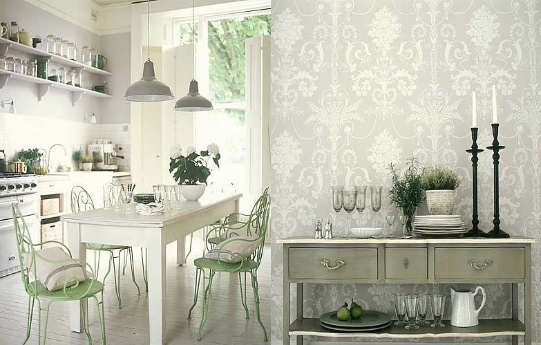 Antique White Kitchen with Jacquard Wallpaper. White jacard wallpaper