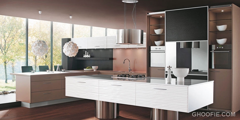 Amazing brown kitchen with white kitchen island. Large glass wall kitchen to view garden around the house.
