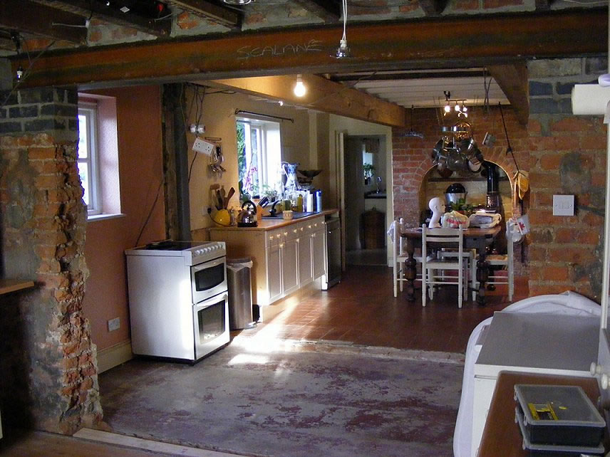 Even crude and exposed brick walls can look effective in a rustic kitchen.