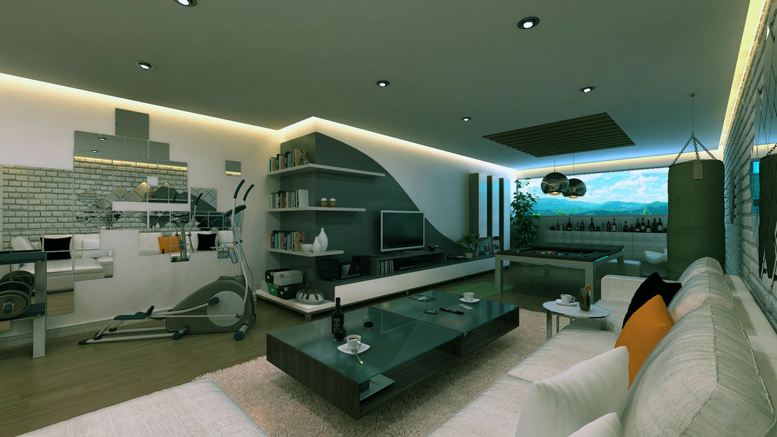 Games and Gym in One Space Design. A rug beneath a coffee table and a few cushions to the sofa to add warmth and pops of color.