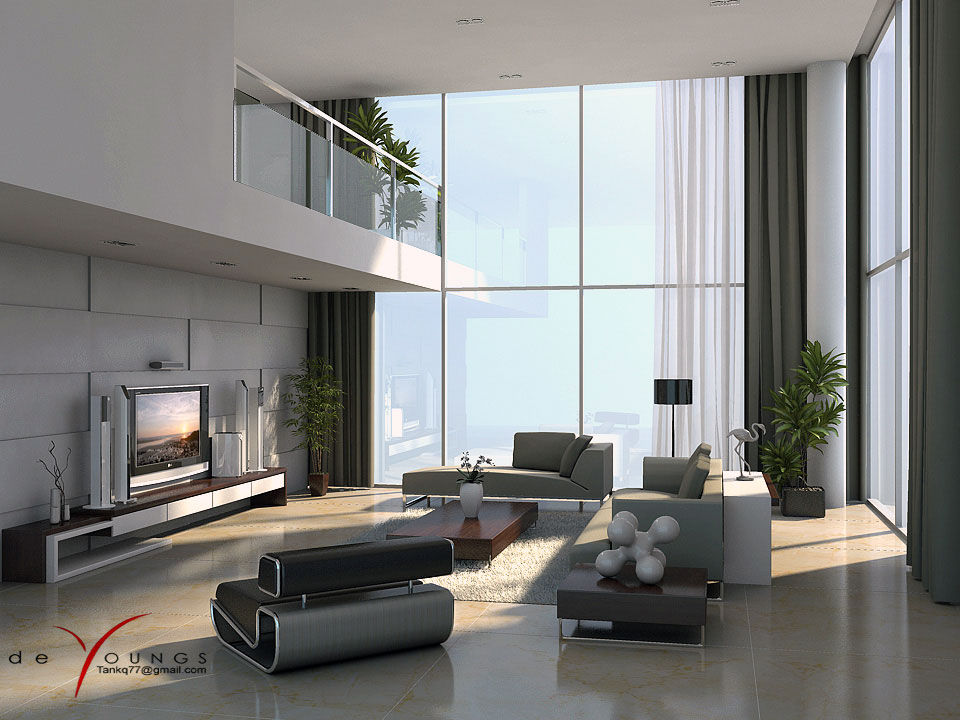 Modern Grey White Lounge Mezzanine House. Modern living room concept with large glass window ideas.