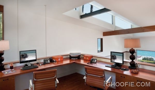 Appealing attic office design with Herman Miller chair. Design office on the attic of this very interesting because the decor is balanced and appropriate lighting system. Brown color combination on the table, chairs and floors provide beauty.