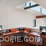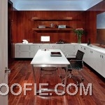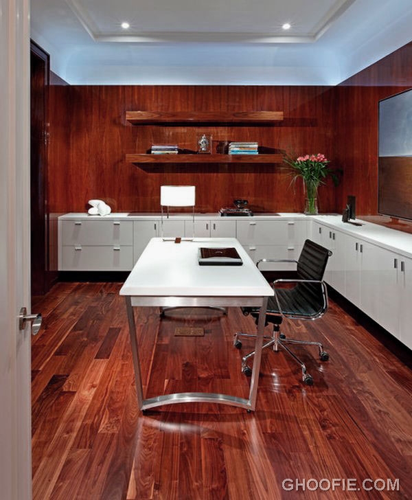 Elegant office design with Herman Miller chair. This is a large office space design. With the overall color of the wood and white accents on the table and furniture make an exquisite balance.